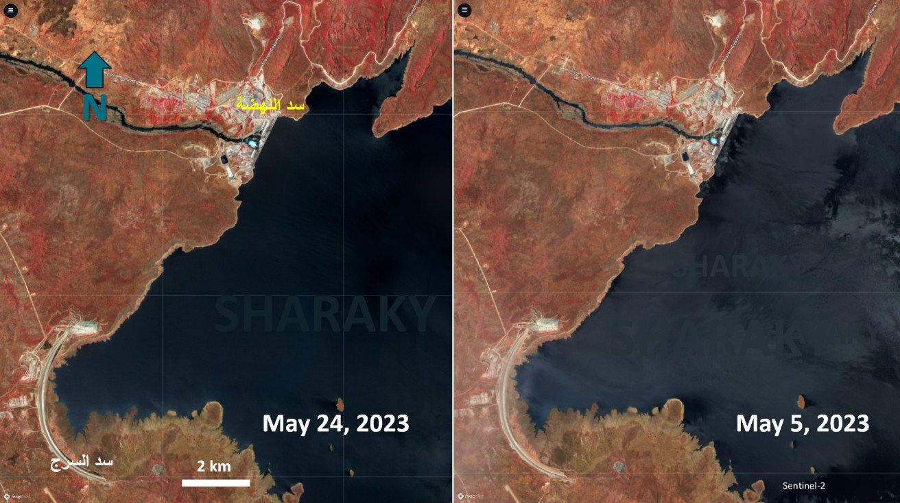 وتابع الدكتور عباس شراقي حديثه عن انخفاض منسوب المياه في بحيرة سد النهضة فقال: “وظل هذا دون تغيير واضح خلال مايو نظرًا لتساوى الإيراد عند سد النهضة 22 مليون متر مكعب في اليوم مع المنصرف من بوابة التصريف الشرقية رغم زيادة فتحها خلال الأسبوعين الماضيين بعد الإشارة إلى انخفاض مخزون سد الروصيرص وانحسار والتخوف من تأثير المياه المنصرفة القليلة على محطات الشرب فى السودان”.