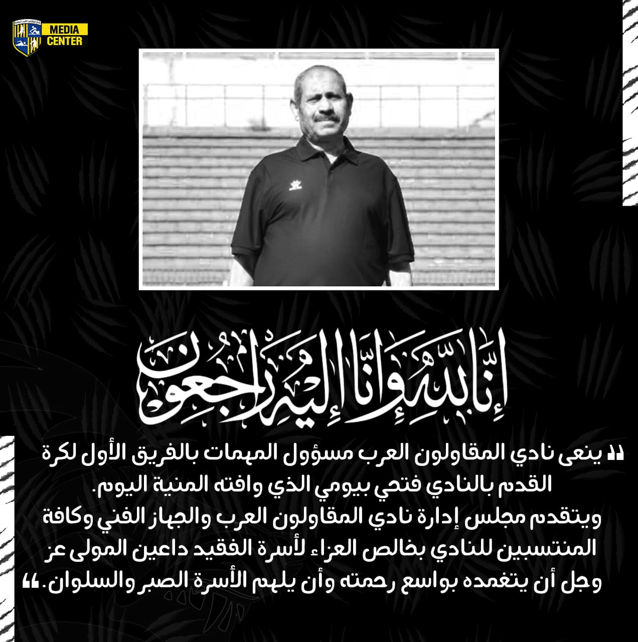 ينعى نادي المقاولون العرب مسؤول المهمات بالفريق الأول لكرة القدم بالنادي فتحي بيومي الذي وافته المنية اليوم.