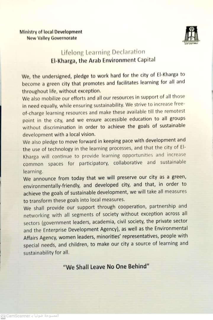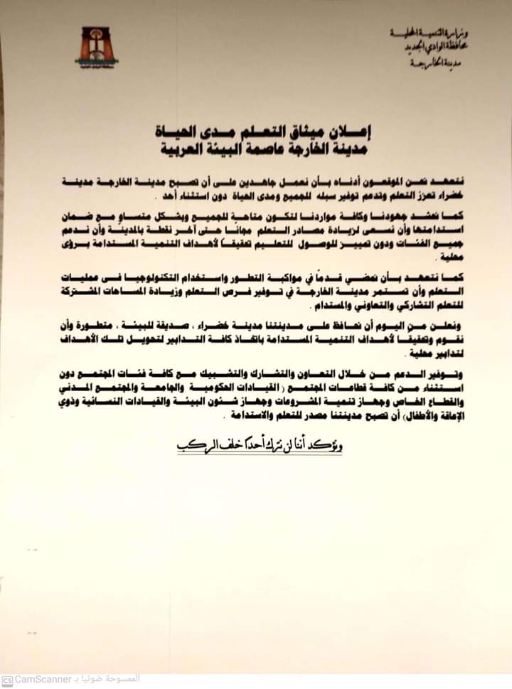 محافظ الوادي الجديد يُعلن ميثاق الخارجة مدينة للتعلم مدى الحياة
