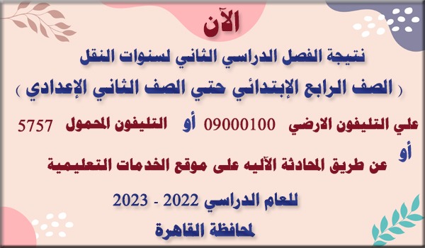 وأعلنت مديرية تعليم القاهرة ظهور نتيجة الترم الثاني 2023 على التليفون الأرضي 09000100 أو التليفون المحمول 5757 أو عن طريق المحادثة الآلية في اللينك .