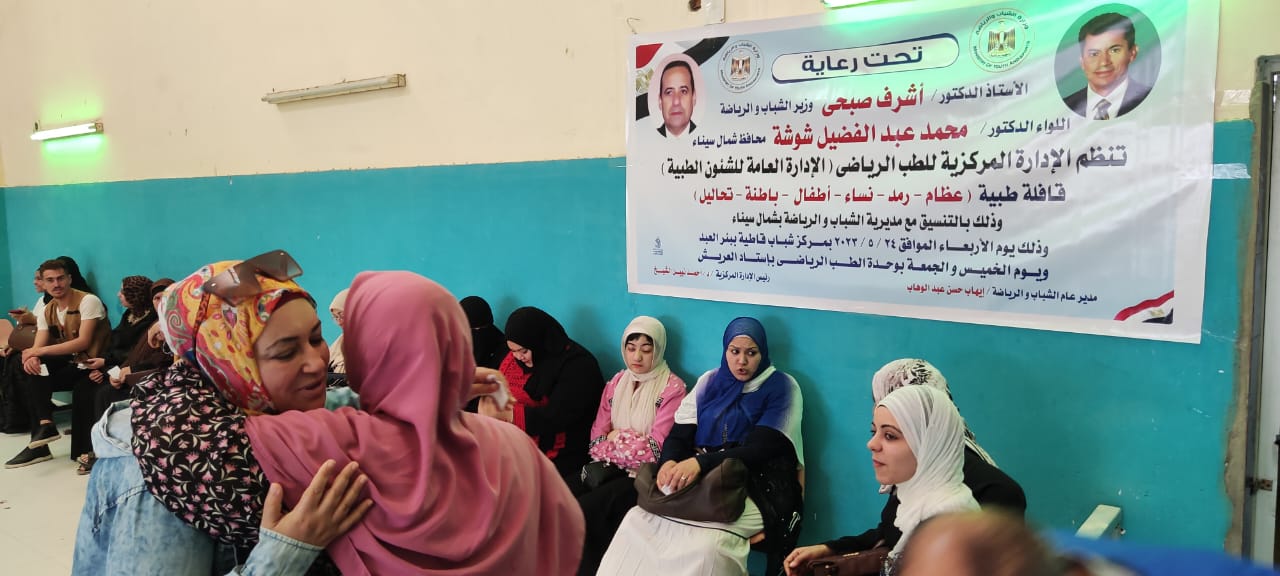 وتنفذ الإدارة العامة للشئون الطبية برئاسة دكتورة ناهد حجاج مدير ادارة الشئون الطبية قافلة طبية بالتعاون مع مديرية الشباب والرياضة بشمال سيناء برئاسة ايهاب حسن عبد الوهاب مدير المديرية، بوحدة الطب الرياضى محافظة شمال سيناء وذلك بهدف تقديم اوجه الرعاية الصحية والخدمات الطبية فى تخصصات ( باطنة. عظام. قلب. تحليل. أسنان. عيون. توعية ثقافية ) كخدمة مجتمعية وذلك بمنطقة بئر العبد.