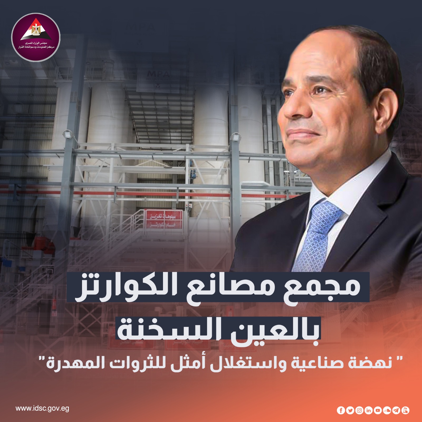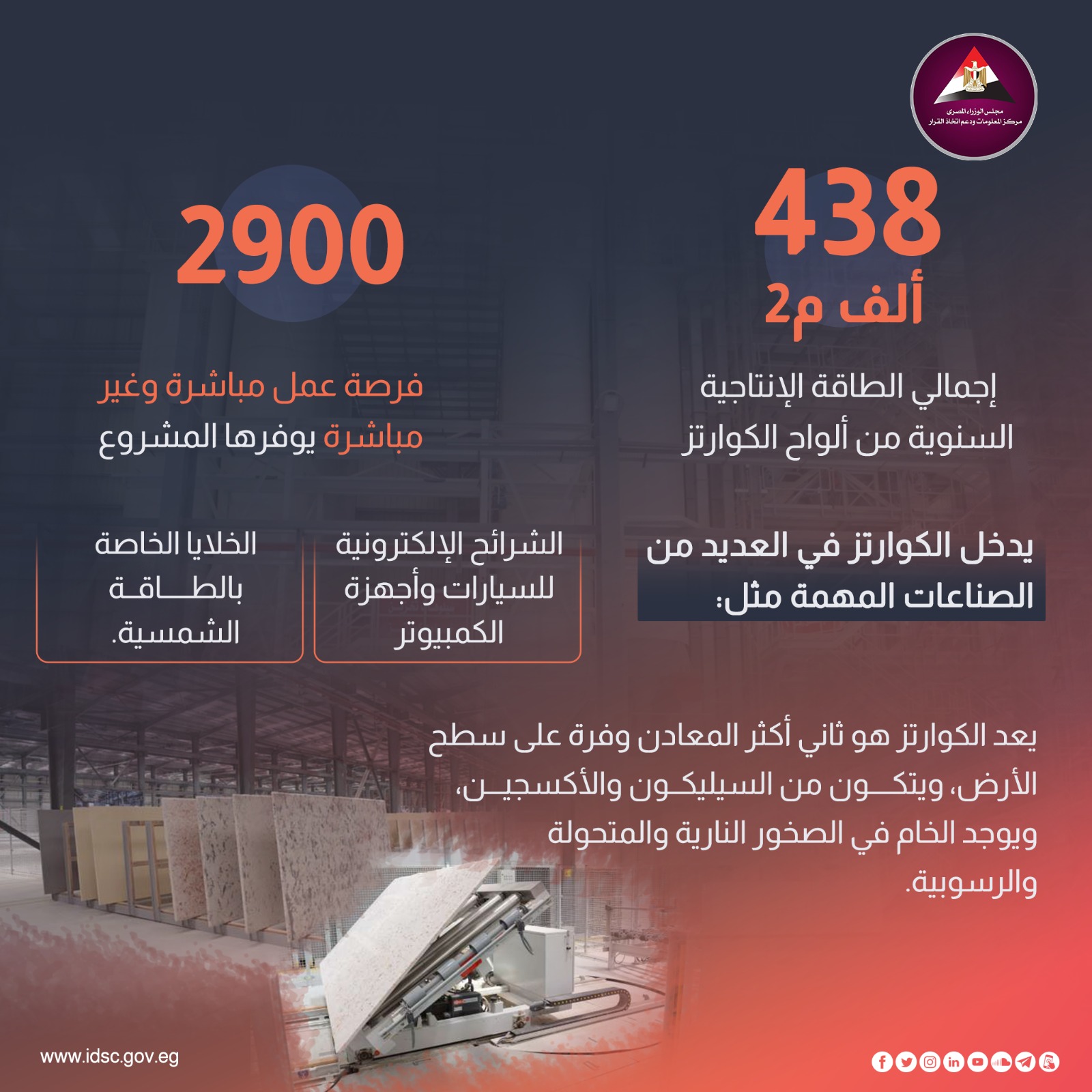 نشر مركز المعلومات ودعم اتخاذ القرار بمجلس الوزراء، عددًا من الإنفوجرافات على صفحته الرسمية بموقع التواصل الاجتماعي "فيس بوك"، حول افتتاح الرئيس عبد الفتاح السيسي، اليوم الخميس، لـ أول مجمع مصانع لإنتاج الكوارتز في الشرق الأوسط وإفريقيا، بطاقة إنتاجية 438 ألف متر مربع من المعدن، تعظيمًا للاستفادة من حجم احتياطي مصر من خام الكوارتز، الذي يصل إلى نحو 3.5 ملايين طن بنسبة نقاوة تصل إلى 99%، وهو ما يجعل مصر تمتلك ميزة تنافسية كبيرة في تلك الصناعة.