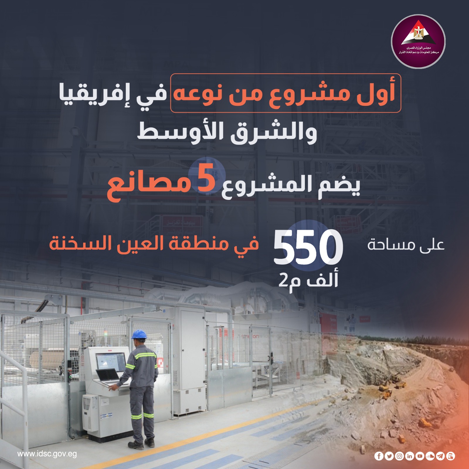 وذكرت الإنفوجرافات، أن إنشاء المجمع في العين السخنة استغرق نحو عام ونصف، ويضم 5 مصانع، وهي: مصنع التكسير الأولي لخام الكوارتز بمنطقة الكوارتز في منطقة "مروة السويقات" بمرسى علم، والذي يقع على مساحة 250 ألف م2 وتصل طاقته الإنتاجية إلى 140 ألف طن سنويًّا، بالإضافة إلى 4 مصانع بمنطقة العين السخنة تقع على مساحة 300 ألف م2، من بينها: مصنع التكسير الذي يبلغ طاقته الإنتاجية حوالي 140 ألف طن سنويًّا، ومصنعي طحن خام الكوارتز بطاقة تبلغ 140 ألف طن سنويًّا، حيث تبلغ القدرة الإنتاجية السنوية من المجمع الصناعي نحو 438 ألف م2 من ألواح الكوارتز سنويًّا، ويوفر المشروع نحو 2900 وظيفة مباشرة وغير مباشرة للعاملين المصريين.