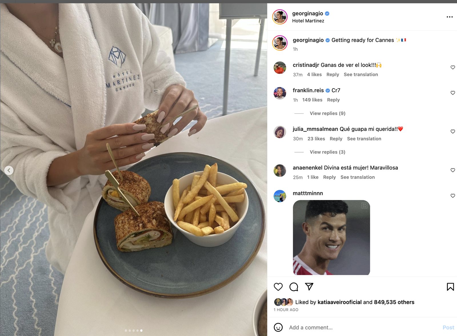 مهرجان كان، وصلت صباح اليوم، جورجينا رودريجيز، خطيبة لاعب نادي النصر السعودي لكرة القدم، كريستيانو رونالدو، لمدينة كان الفرنسية، للمشاركة في فاعليات الدورة ٧٦ للمهرجان.