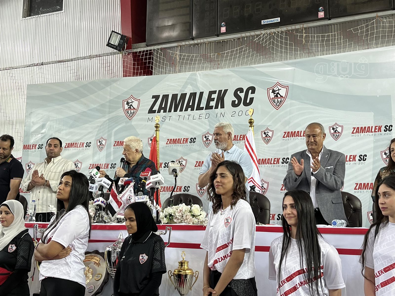 مرتضى منصور يكرم فريق طائرة الزمالك سيدات ورجال في مؤتمر صحفي (صور)