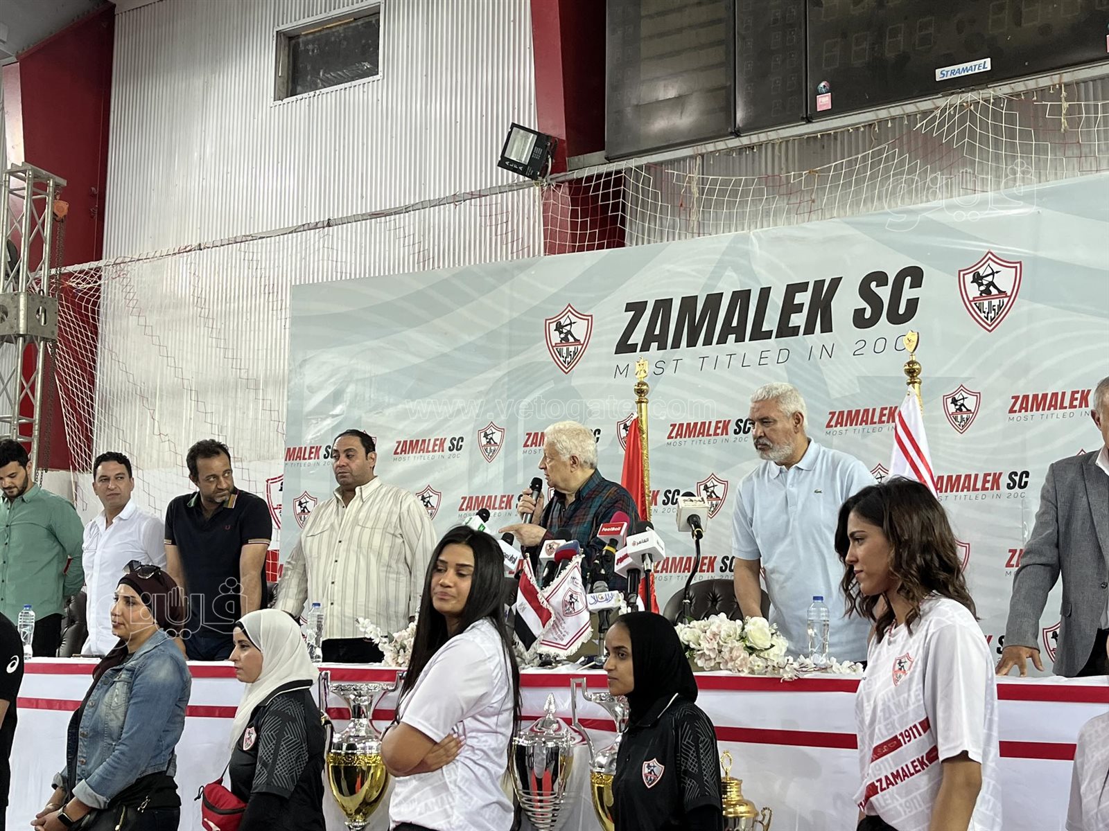 الزمالك، كرم مرتضى منصور رئيس نادي الزمالك الصادر بحقه حكم قضائي بالعزل ومجلس الإدارة، فريق سيدات ورجال الطائرة في مؤتمر الصحفي بعد التتويج بالعديد من البطولات في الموسم الجاري.