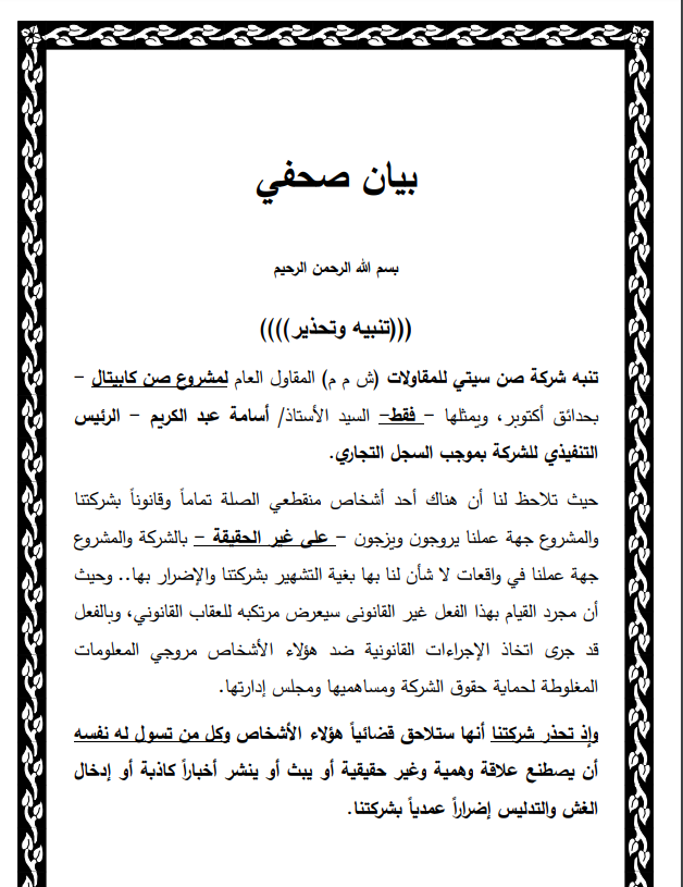 تنبه شركة صن سيتي للمقاولات (ش م م) المقاول العام لمشروع صن كابيتال - بحدائق أكتوبر، ويمثلها - فقط - السيد الأستاذ أسامة عبد الكريم، الرئيس التنفيذي للشركة بموجب السجل التجاري.