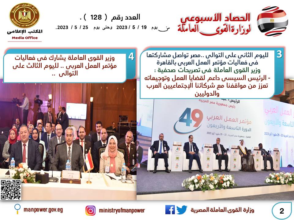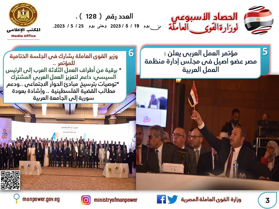 وأعلن مؤتمر العمل العربي عن فوز مصر ممثلة في وزارة القوى العاملة، كعضو اصيل ضمن فريق الحكومات في مجلس إدارة منظمة العمل العربية إحدى منظمات جامعة الدول العربية،بجانب قطر والمغرب وفلسطين وليبيا،وذلك خلال الفترة من 2023 إلى 2025..