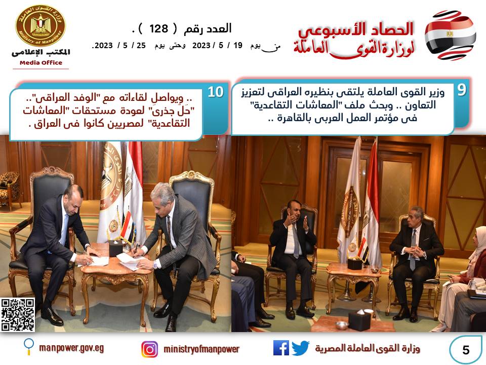 وجاء في البيان الصحفي أيضاَ أن اللقاءات التي استمرت على مدار اليومين، وحضرها بجانب وفد وزارة العمل العراقية،ممثلون عن هيئة الضمان الإجتماعي،ومدير مصرف الرافدين بالقاهرة،جرى خلالها توقيع اتفاق مكتوب بشأن تسهيل إجراءات حصول المصريين أصحاب المعاشات التعاقدية،الذين سبق لهم العمل بالعراق، أو ورثتهم على مستحقاتهم المتأخرة،وكذلك صرف معاشاتهم بشكل منتظم.