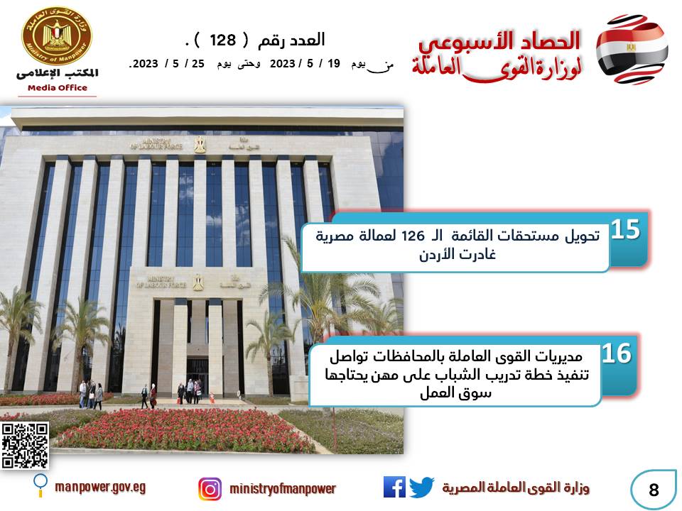وفي بداية الأسبوع أيضا أعلنت الوزارة أن مكتب التمثيل العمالي التابع للوزارة بالسفارة المصرية بالعاصمة الأردنية عمان، تابع مع المسئولين بمؤسسة الضمان الاجتماعي بالأردن- استكمالا لما تم تحويله سابقا- عملية تحويل القائمة الـ 126 من مستحقات الضمان الاجتماعي لنحو 53 عاملًا مصريًا لدى "المؤسسة" غادروا عمان نهائيا.