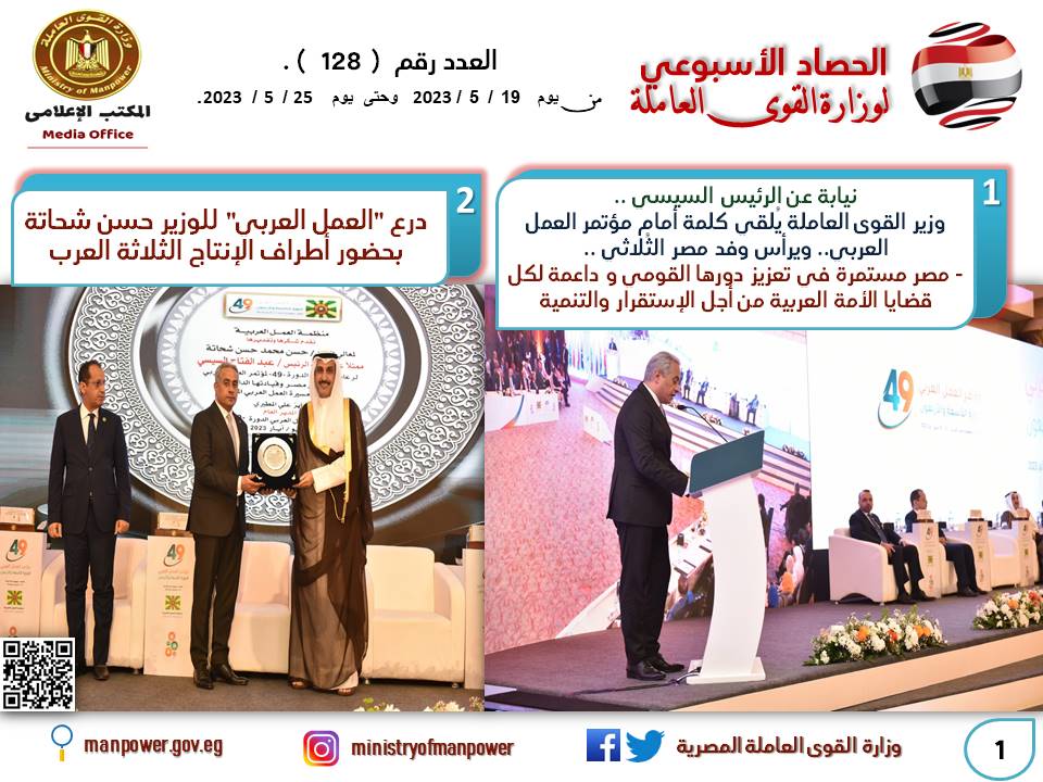 وفي نهاية الأسبوع شارك وزير القوى العاملة حسن شحاتة،فى فعاليات الجلسة الختامية للدورة الـ 49 لمؤتمر العمل العربى،حيث جاءت التوصيات لتؤكد على أهمية العمل العربي المشترك في قضايا العمل،وتعزيز مبادئ وأسس الحوار الاجتماعي بين أطراف الإنتاج،حيث شهدت الجلسة الختامية كلمات لرؤساء فرق الحكومات وأصحاب الأعمال والعمال،والمدير العام لمنظمة العمل العربية،ووجهوا الشكر والتقدير للرئيس عبدالفتاح السيسي،وتلا المدير العام لمنظمة العمل العربية فايز المطيري برقية إلى الرئيس السيسي راعي المؤتمر على رعايته لفعاليات هذه الدورة،واثنوا على دور مصر كدولة للمقر في رعاية كل عمل عربي مشترك،وجاء في البرقية أن الرئيس السيسي داعم للعمل العربي المشترك من أجل التنمية،كما تلا برقية إلى الرئيس الفلسطيني محمود عباس ابو مازن،مؤكدا على دعم مطالب القضية الفلسطينية.