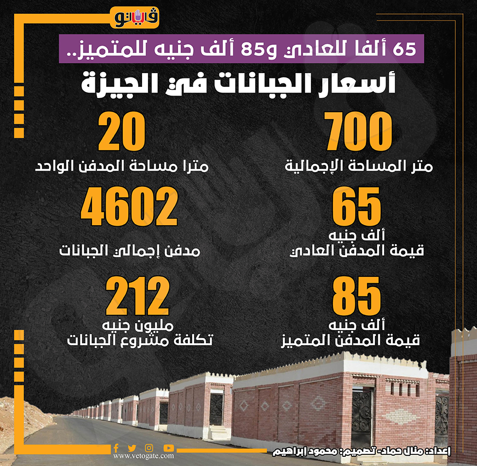65 ألفا للعادي و85 ألف جنيه للمتميز.. أسعار الجبانات في الجيزة (إنفوجراف) الإثنين 29/مايو/2023 - 07:33 م 5/29/2023 7:33:49 PM مقابر محافظة الجيزة، فيتو منال حماد شارك طباعة 18 حجم الخط شارك طباعة الجبانات مشروع الجبانات رصف الطرق ساحة