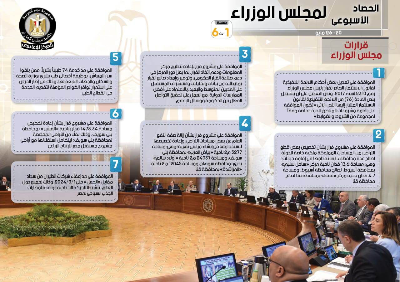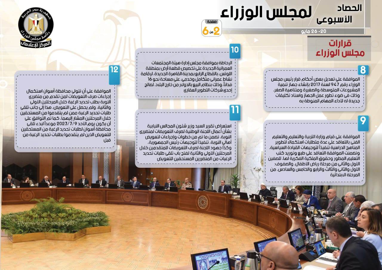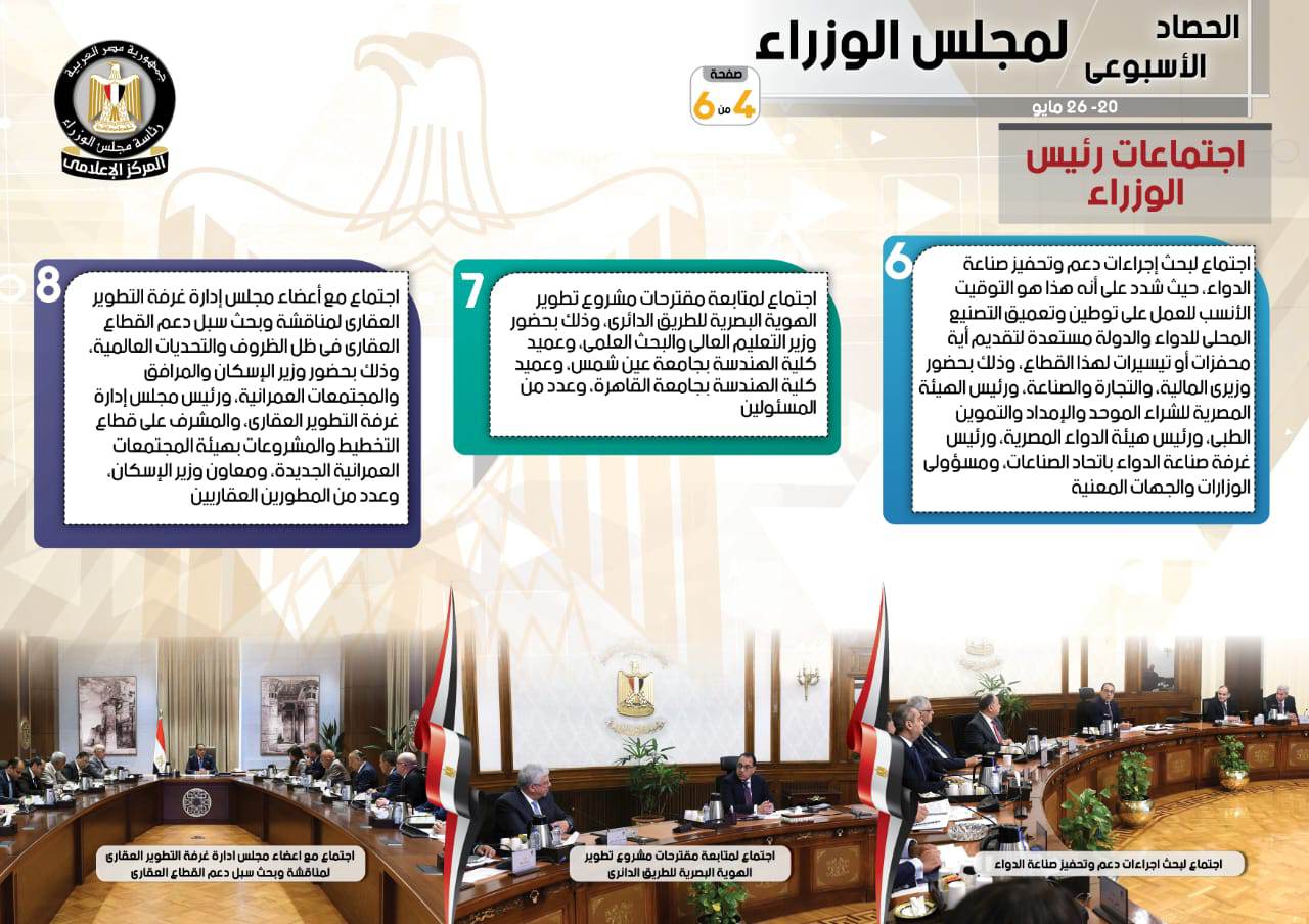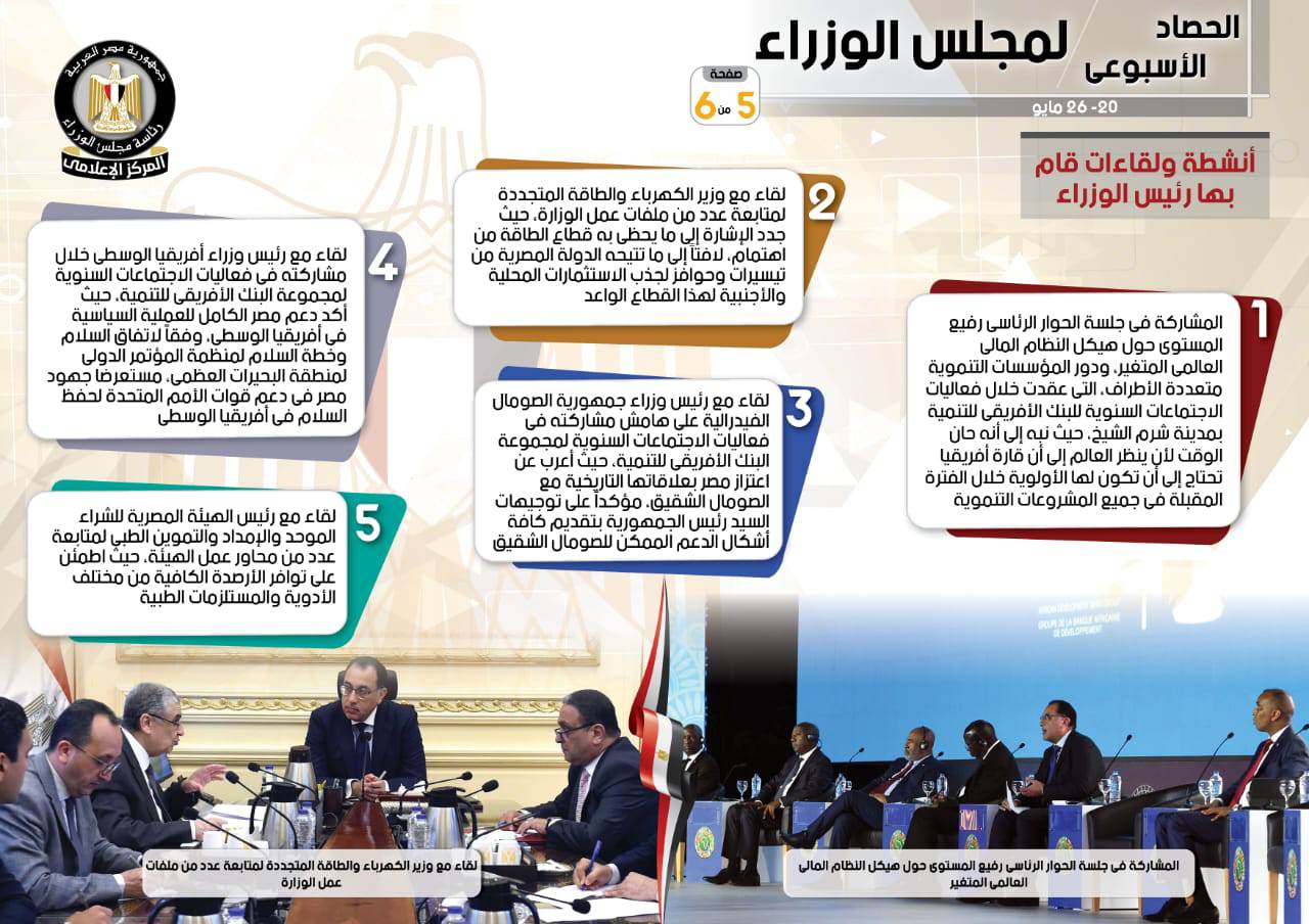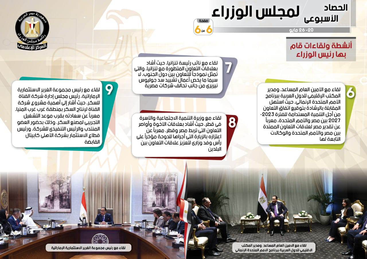 نشر المركز الإعلامي لمجلس الوزراء، تقريرًا شمل إنفوجرافات سلط من خلالها الضوء على الحصاد الأسبوعي لمجلس الوزراء، وذلك خلال الفترة من 20 حتى 26 مايو 2023، والذي تضمن الموافقة على عدد من القرارات، فضلًا عن الاجتماعات واللقاءات التي عقدها الدكتور مصطفى مدبولي، رئيس مجلس الوزراء، بالإضافة إلى ما قام به سيادته من أنشطة.