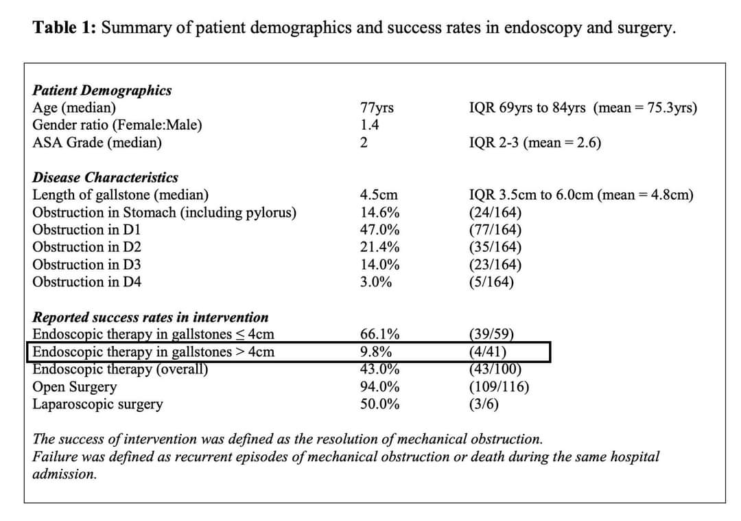 واستغرق استخراج حصوه من الاثني عشر حجمها ٥.٥ سم كانت بالمرارة من ٤٧ عاما وسببت انسدادا كاملا بالاثني عشر(bouvert’s syndrome) منظار استمر لمدة ٧ ساعات بنجاح.
