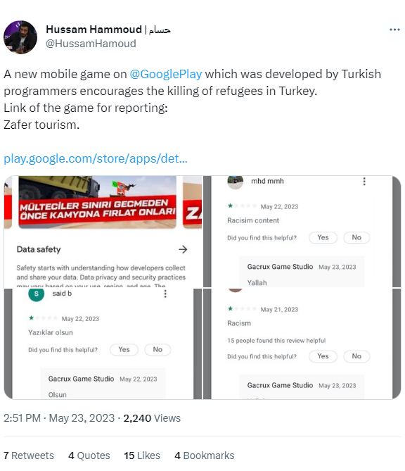 ويوم الأربعاء، كتب الصحافي السوري حسام حمود في تغريدة له على تويتر: "لعبة جديدة للهاتف على جوجل بلاي، تم تطويرها علي يد مبرمجين أتراك، تشجع على قتل اللاجئين في تركيا"، ليرد حساب "جوجل بلاي" على تويتر على الصحافي السوري، قائلا: "هذا لا يبدو جيدا يا حسام. نأخذ هذه التقارير على محمل الجد ونقدر تواصلك معنا، رجاء إرسال ملاحظاتك حتى يتمكن فريقنا من التحقيق فيها"، وفي اليوم التالي، تم حذف اللعبة من متجر جوجل.