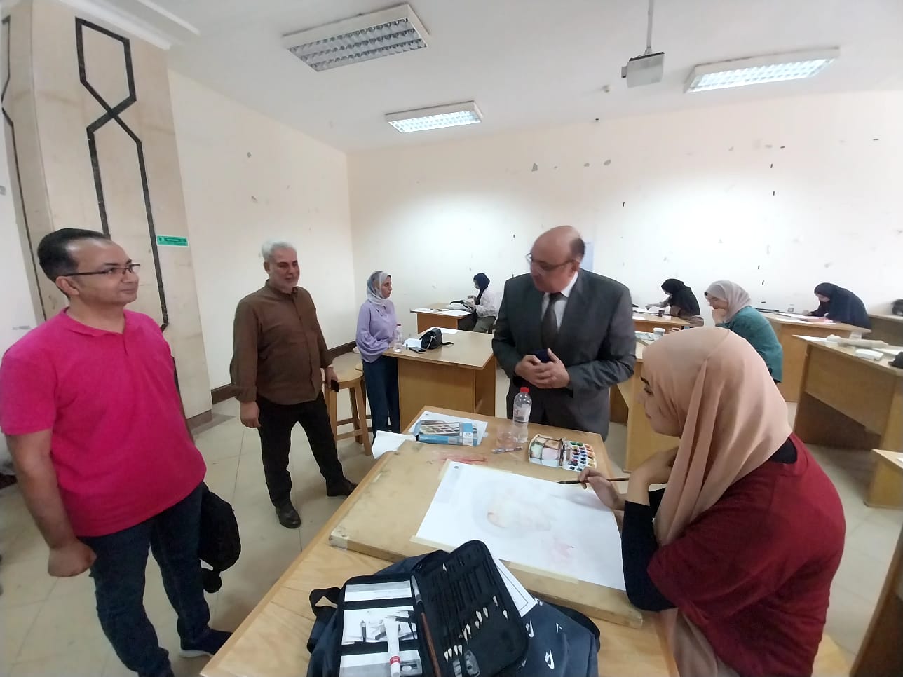 وكان في استقبال نائب رئيس الجامعة بكلية الفنون الجميلة الدكتور عمر غنيم عميد كلية الفنون الجميلة. استقبله بكلية التربية الدكتور محمد العجمي عميد كلية التربية، الدكتور زبيدة محمد وكيل كلية التربية لشئون التعليم والطلاب.