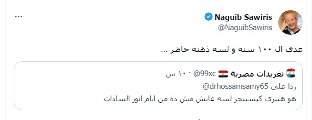 وكتب المهندس نجيب ساويرس عن هنري كيسنجر تغريدة على تويتر قال فيها: "عدى الـ ١٠٠ سنه ولسه ذهنه حاضر…".