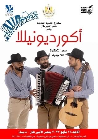 يستضيف قصر الأمير طاز والتابع لقطاع صندوق التنمية الثقافية، حفل فني لفريق أكورديونيلا للموسيقى وذلك في تمام الثامنة من مساء غدا الأحد الموافق ٢٨ مايو الجاري.
