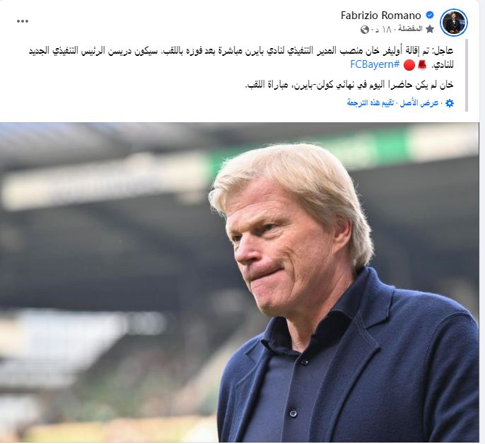 أقالت إدارة بايرن ميونخ المدير التنفيذي للفريق أوليفر كان من منصبه، بعد فوز الفريق البافاري بلقب البوندسليجا دون إظهار أي تفاصيل توضح سبب إقالته.