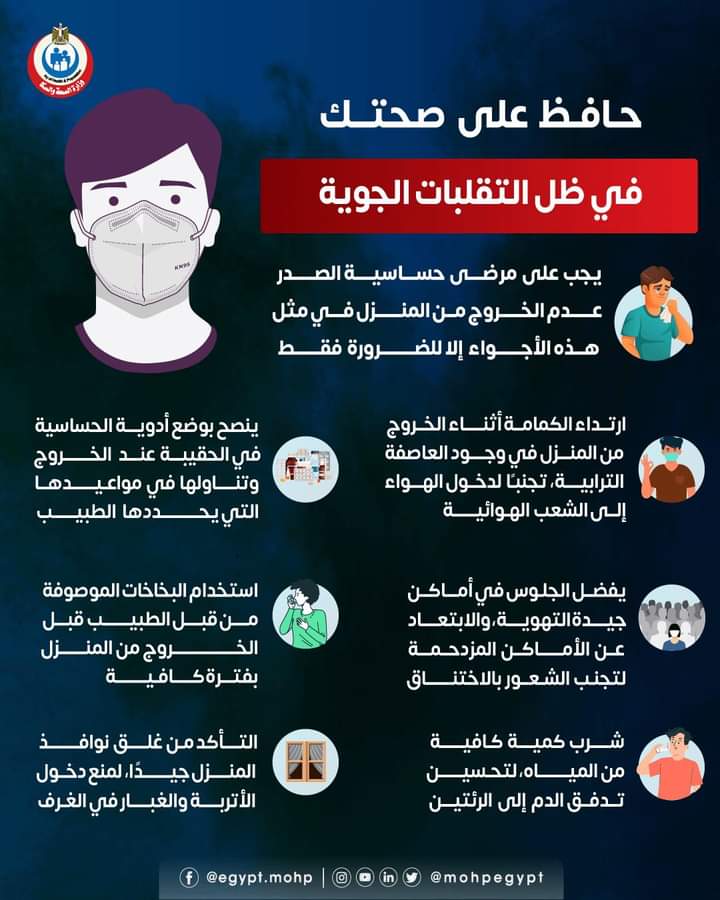 وجهت وزارة الصحة عددا من النصائح للمواطنين، في ظل التقلبات الجوية خاصة لمرضي حساسية الصدر لمنع تعرضهم لمضاعفات نتيجة تغيرات الجو ووجود أتربة.
