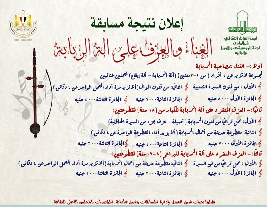 أعلن المجلس الأعلى للثقافة بأمانة الدكتور هشام عزمى عن نتيجة مسابقة "الغناء والعزف على آلة الربابة"، والتي نظمها المجلس من خلال لجنة التراث الثقافي غير المادي؛ وبالتعاون مع لجنة الموسيقى والأوبرا والبالية خلال شهر أغسطس ٢٠٢٢.