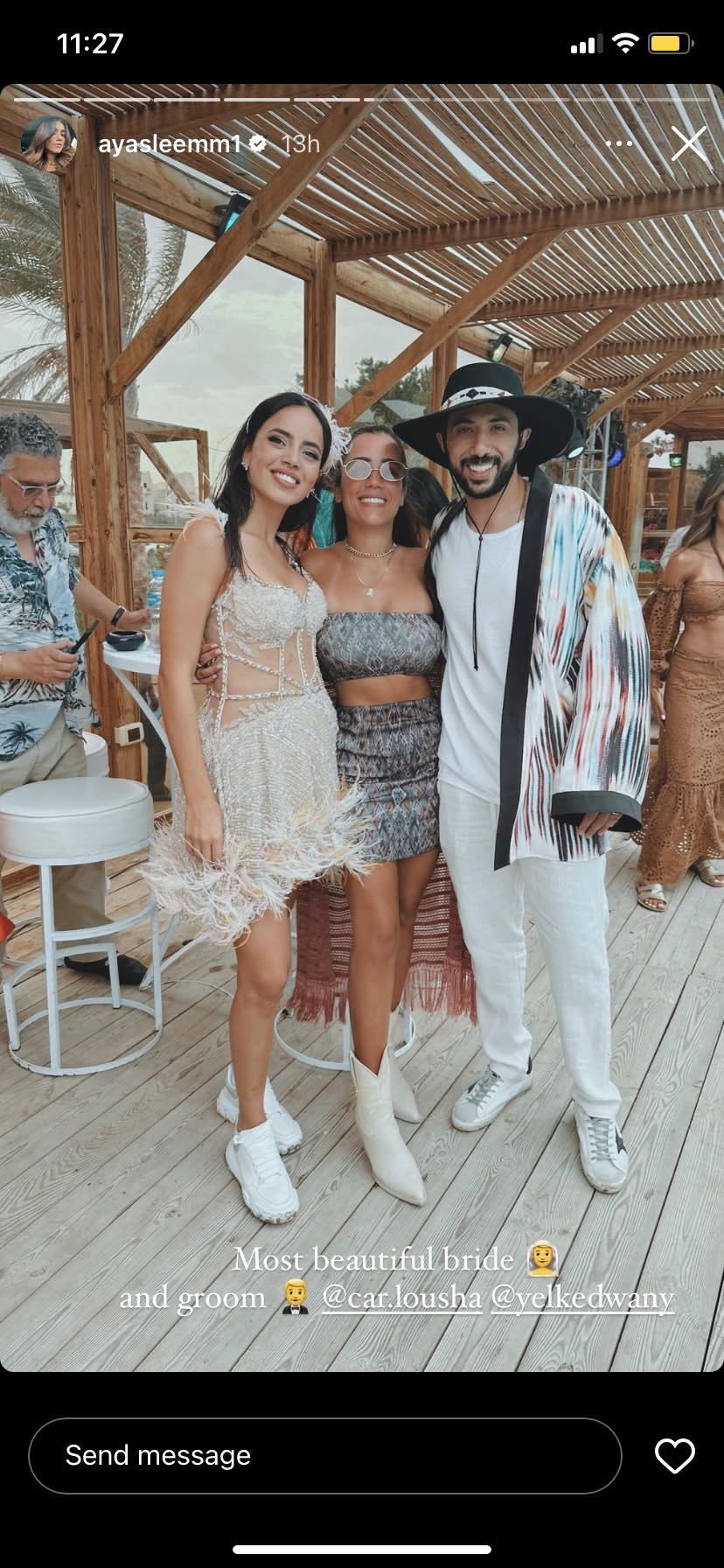 وخطف العروسان الأنظار ممن حولهم، حيث ارتدى يوسف ماجد الكدواني بدلة أنيقة، بينما ارتدت عروسه فستانًا أبيض أنيقًا.