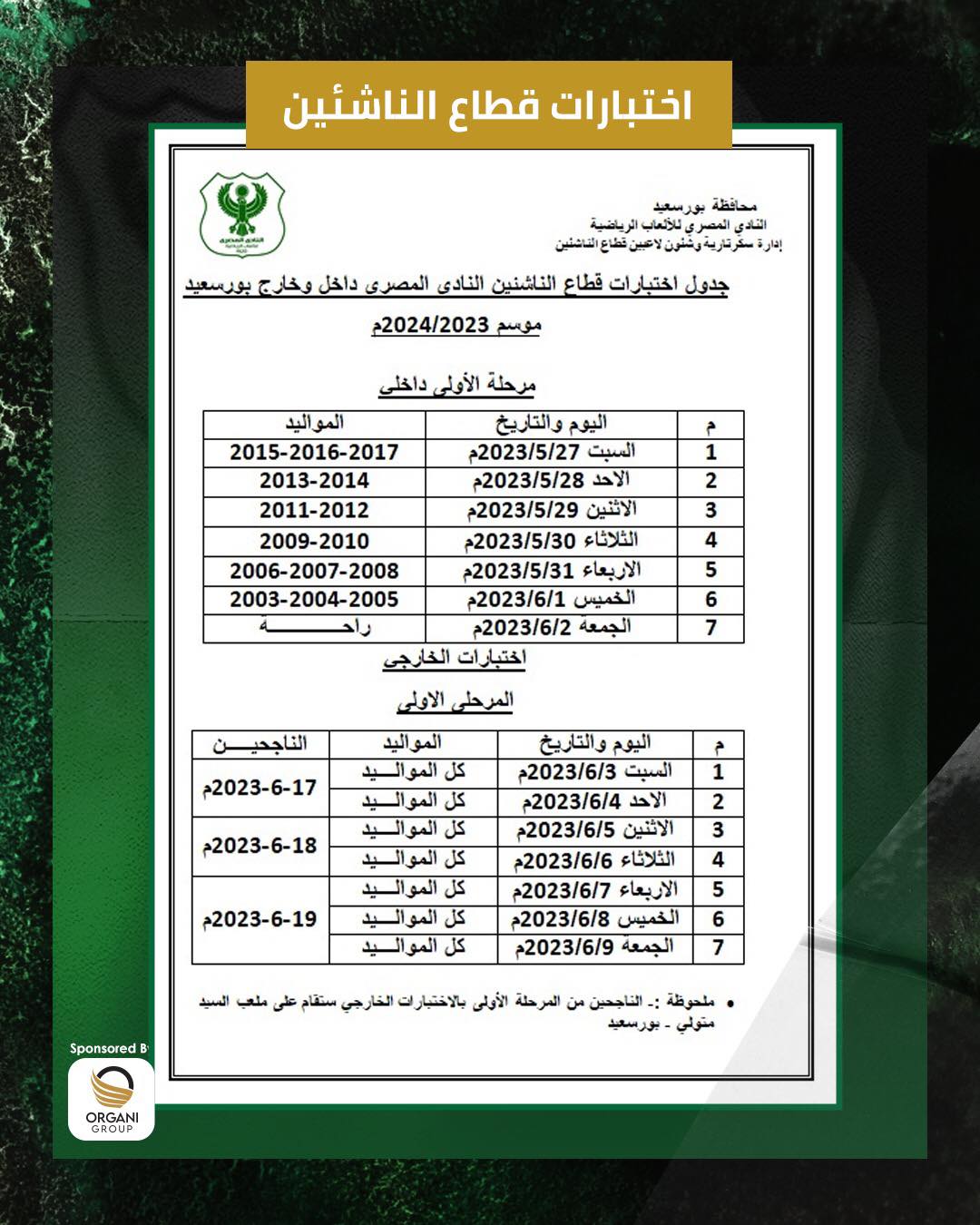 وانطلقت اختبارات الناشئين 2023 بالنادي المصري البورسعيدي يوم 27 مايو الماضي للاختبارات الداخلية بالنادي أما اختبارات ناشئين اللنادي المصري الخارجية فتبدأ يوم 3 يونيو المقبل.