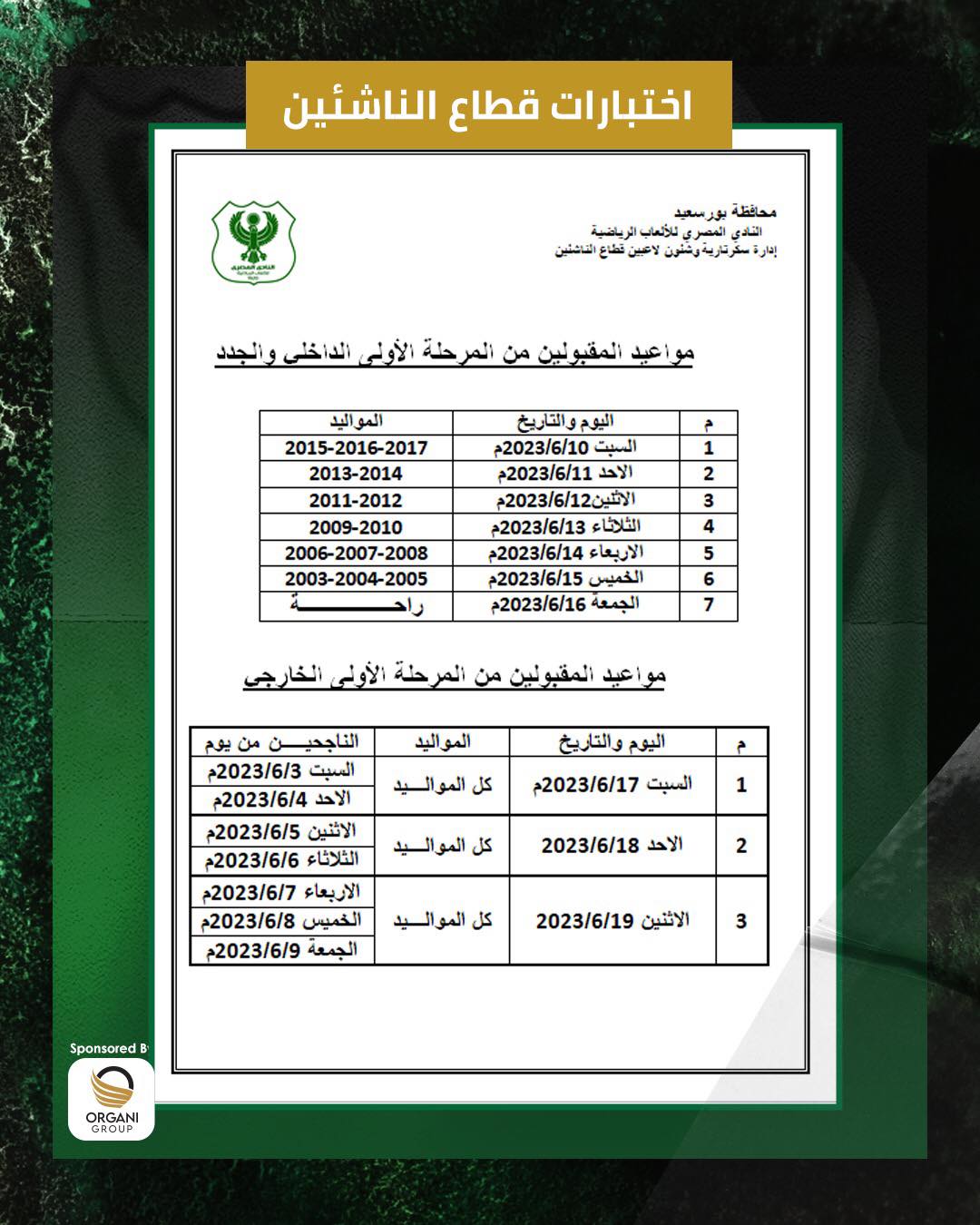 وجاء جدول مواعيد اختبارات الناشئين بالنادي المصري كالتالي: