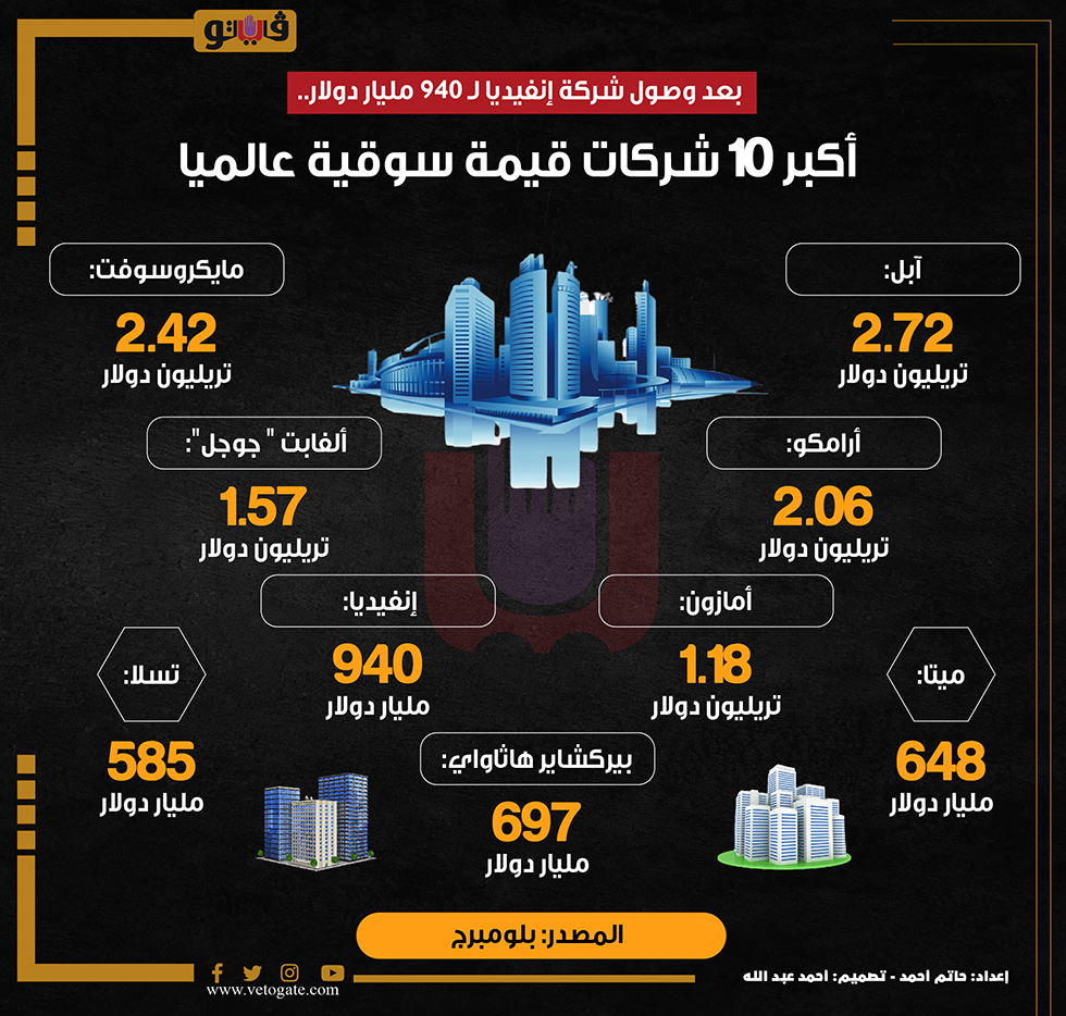 بعد وصول شركة إنفيديا لـ 940 مليار دولار.. أكبر 10 شركات قيمة سوقية عالميا ( إنفوجراف) الأحد 28/مايو/2023 - 11:13 م 5/28/2023 11:13:32 PM شركة إنفيديا، فيتو حاتم أحمد شارك طباعة 18 حجم الخط شارك طباعة إنفيديا ابل بلومبرج أكبر 10 شركات قيمة سوقية عالميا مايكروسوفت ارامكو تسلا