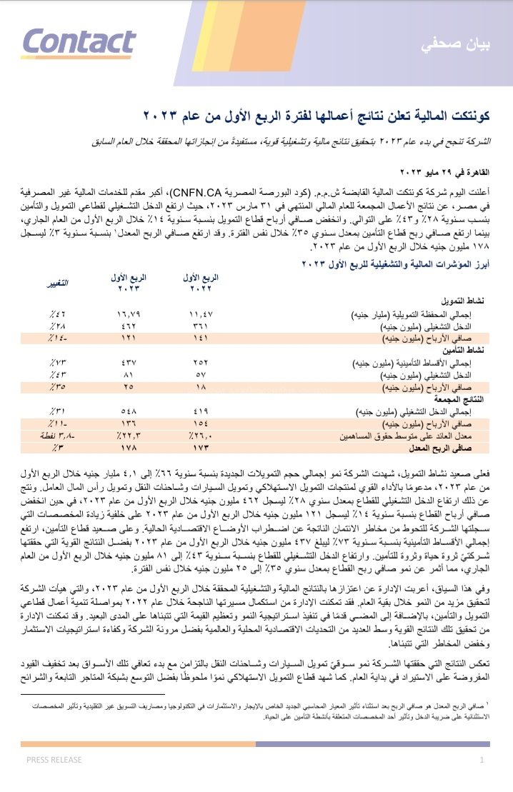 كونتكت المالية القابضة تعلن نتائج أعمالها لفترة الربع الأول من 2023