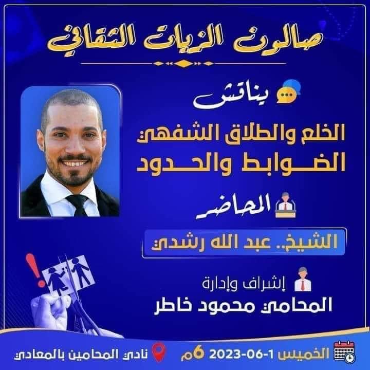 وكان المحامي منتصر الزيات، أعلن عبر حسابه الشخصي على موقع التواصل الاجتماعي، عن استضافة عبدالله رشدي، في محاضرة تحت عنوان “ الخلع والطلاق الشفهي،، الضوابط والحدود” وذلك ضمن فعاليات صالون الزيات الثقافي بالنادي النهري للمحامين بالمعادي، وهو ما قوبل باستهجان ورفض شديد من قطاع واسع من المحامين عبروا عنه على حساباتهم الشخصية على مواقع التواصل الاجتماعي.