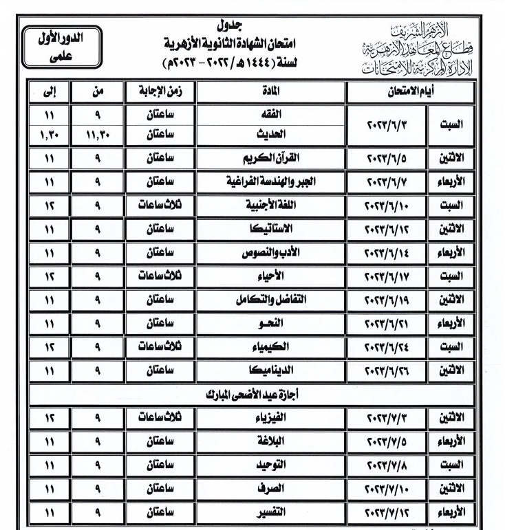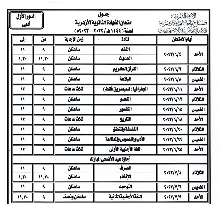 الشهادة الثانوية الأزهرية، جدول امتحانات العلمي والأدبي وموعد إجازة عيد الأضحى