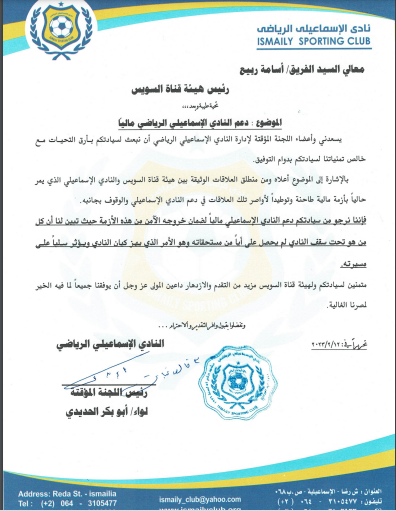 وجاء في الخطاب الذي أرسلته إدارة الإسماعيلي لرئيس هيئة قناة السويس، أن اللجنة التي تدير النادي الإسماعيلي تقدر كل المجهودات الساعية للوقوف بجانب النادي في محنته الحالية: