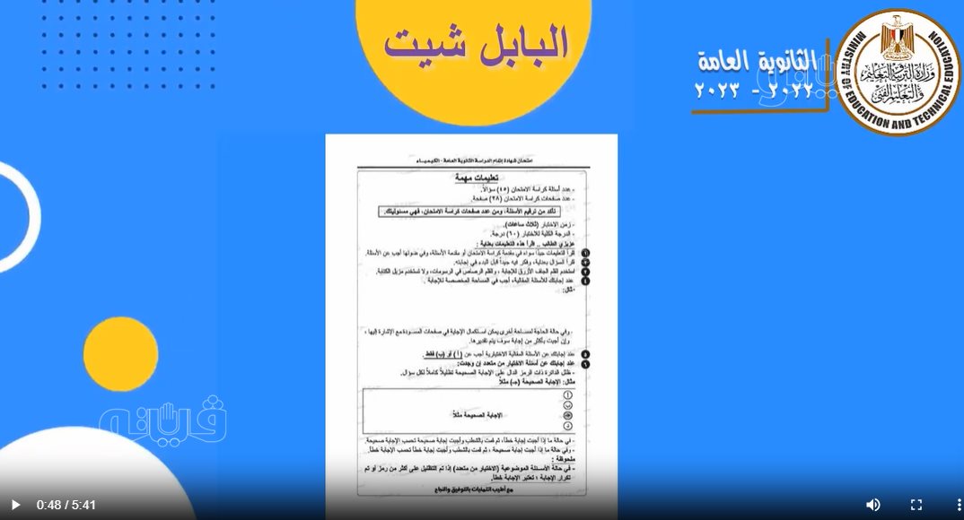 ويتضمن الفيديو شرحا تفصيليا مبسطا وإرشادات هامة للطلاب لطريقة الإجابة عن أسئلة امتحان شهادة الثانوية العامة للعام الدراسى 2022/ 2023، للجزء الخاص بورقة إجابة البابل شيت وورقة الإجابة عن الأسئلة المقالية.