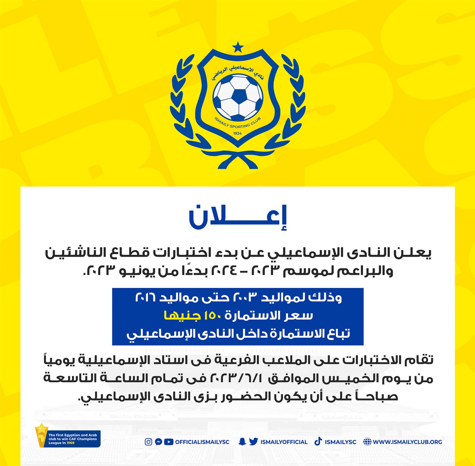 اختبارات الناشئين 2023، أعلن نادي الاسماعيلي موعد اختبارات الناشئين 2023 المقرر انطلاقها في الأول من يونيو المقبل بملاعب النادي الفرعية بالاسماعيلية.