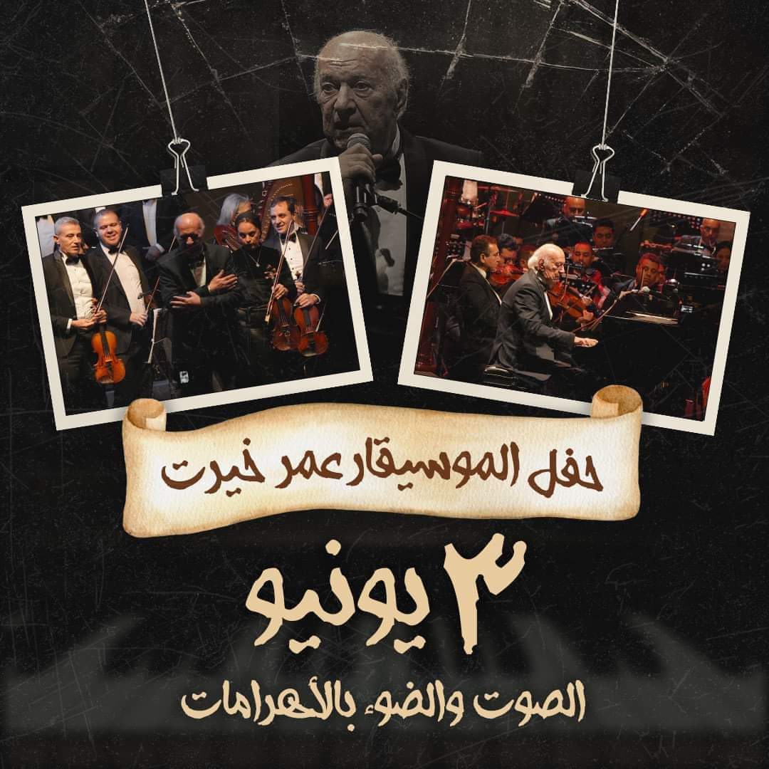 يُحيي الموسيقار الكبير عمر خيرت وفرقة أوركسترا أوبرا القاهرة حفلة موسيقية ضخمة وجديدة، تحت سفح الأهرامات فى أجواء خاصة وسط احتفالات الصوت والضوء، ويُقام الحفل فى 3 يونيو 2023.
