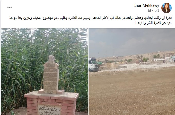 وقالت “مكاوي”، في منشور على حسابها بفيسبوك: “فكرة إن رفات أجدادي وعماتي وأعمامي هناك في الإمام الشافعي وسيتم هدم المقبرة ونقلهم..هو موضوع مخيف وحزين جدا، وهذا بعيد عن قضية الأثر والقيمة”.