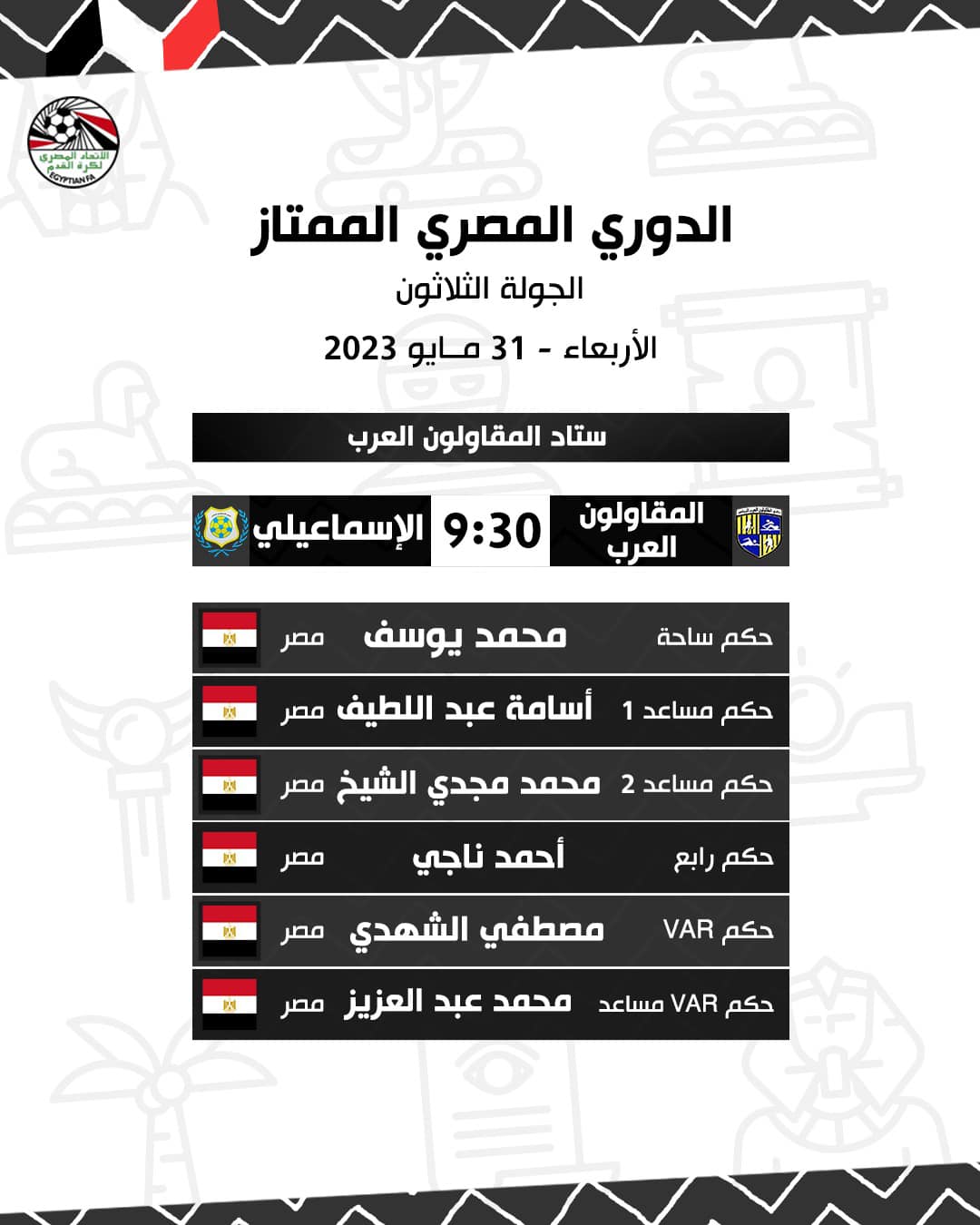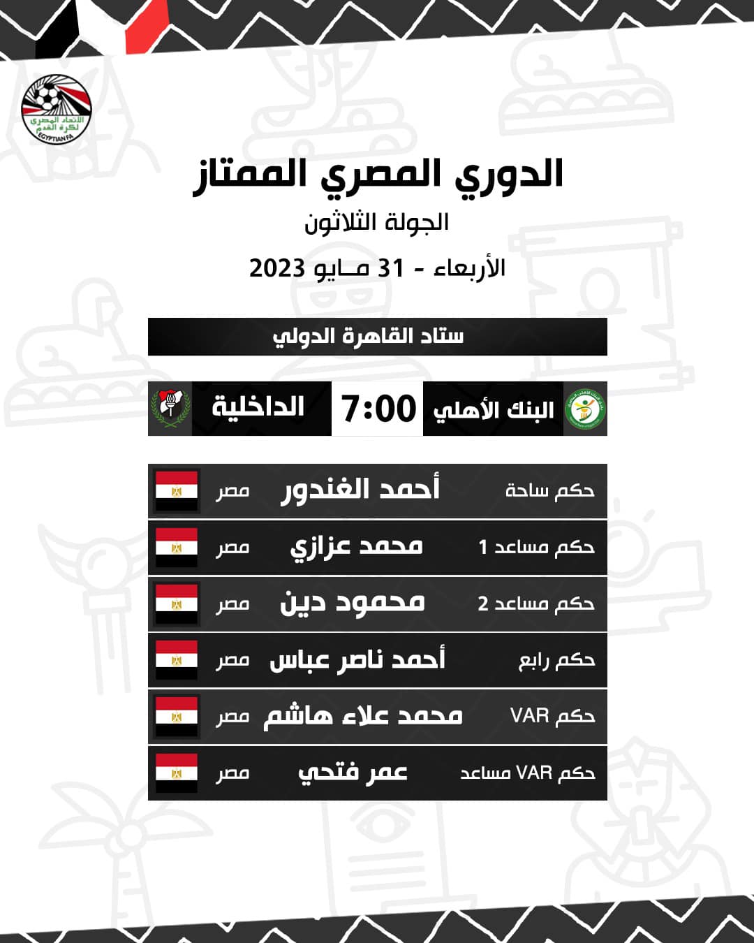 الدوري المصري، أعلنت لجنة الحكام الرئيسية باتحاد الكرة، طاقم حكام مباراة البنك الأهلي أمام الداخلية، ومباراة المقاولون العرب أمام الإسماعيلي المقرر إقامتهما مساء اليوم الأربعاء في افتتاح مواجهات الجولة 30 من الدوري المصري الممتاز على النحو التالي:
