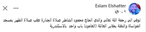 وكتب اسلام الشاطر:"توفي الي رحمة الله تعالي والدي الحاج محمود الشاطر صلاة الجنازة عقب صلاة الظهر بمسجد المواساة والدفنة بمقابر العائلة (العامود) باب واحد بالاسكندرية.