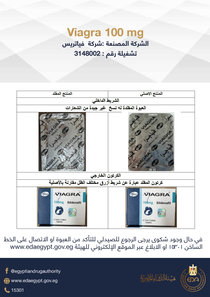كشفت هيئة الدواء المصرية في منشور توعوي لها عن الفرق بين الفياجرا المغشوشة والأصلية بعد تحذير هيئة الدواء المصرية المواطنين من وجود تشكيلة مغشوشة بالسوق برقم 3148002.