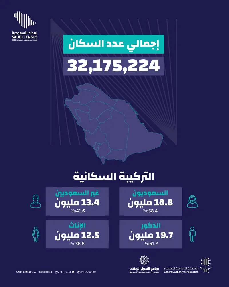 كشفت الهيئة العامة للإحصاء السعودية، اليوم الأربعاء، عن "تعداد السعودية 2022"، بوصول عدد سكان البلاد إلى 32.2 مليون نسمة، فيما بلغت نسبة الأجانب بينهم 41.6%.