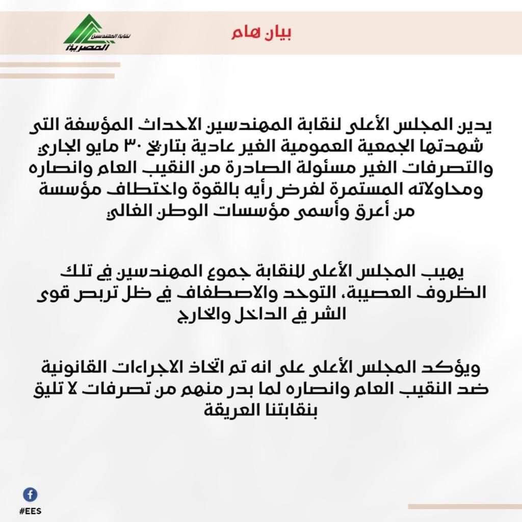 وجاء في نص البيان كالآتي: يدين مجلس نقابة المهندسين الأحداث المؤسفة التي شهدتها الجمعية العمومية غير العادية بتاريخ ٣٠ مايو الجاري، والتصرفات غير المسئولة الصادرة من النقيب العام وأنصاره ومحاولاته المستمرة لفرض رأيه بالقوة واختطاف مؤسسة من أعرق وأسمى مؤسسات الوطن الغالي