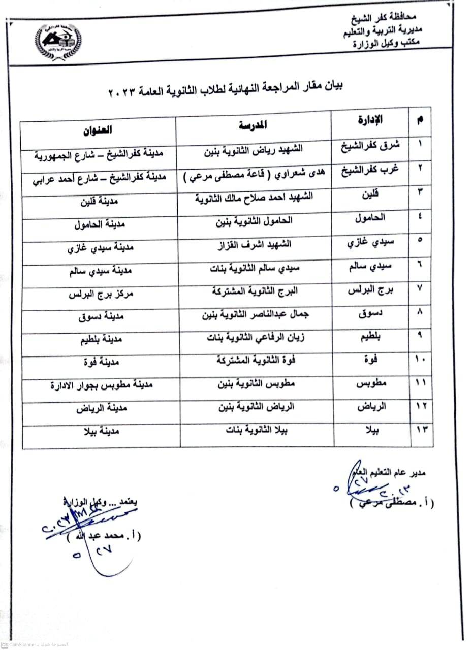 ويوضح الدكتور علي محمد علي، مسئول بحياة كريمة بكفرالشيخ، الأماكن التي يوجد بها المراجعات النهائية للثانوية العامة، وهي: إدارة شرق كفر الشيخ بمدرسة الشهيد رياض الثانوية ومجمع غرب هدي شعراوي، والشهادة احمد صلاح بقلين، والحامول الثانوية بنين، والشهادة أشرف القزاز بسيدي غازي، والثانوية بنات بسيدي سالم، الثانوية المشتركة ببرج البرلس، وجمال عبد الناصر الثانوية بنين بدسوق، وزيان الرفاعي الثانوية بنات بلطيم، وفوه الثانوية المشتركة، ومطوبس الثانوية بنين، والرياض الثانوية بنين، وبيلا الثانوية بنات.