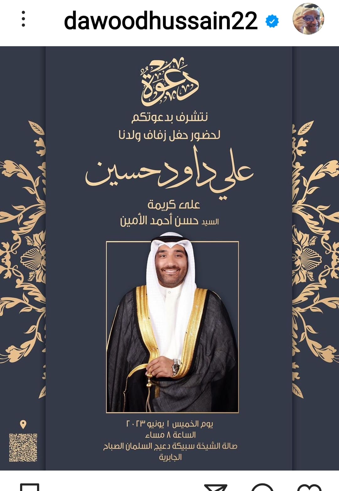 و نشر داوود حسين بطاقة دعوة الحفل، وكتب في البطاقة: "نتشرف بدعوتكم لحضور حفل زفاف ولدنا علي داود حسين على كريمة السيد حسن الأمين يوم الخميس 1يونيو 2023 الساعة الثامنة مساء في صالة الشيخة سبيكة دعيج السلمان الصباح".