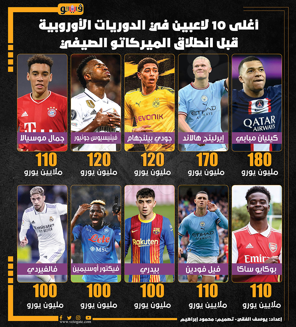 أغلى 10 لاعبين في الدوريات الأوروبية قبل انطلاق الميركاتو الصيفي (إنفوجراف) الخميس 01/يونيو/2023 - 05:03 م 6/1/2023 5:03:03 PM هالاند يوسف الفقي شارك طباعة 18 حجم الخط شارك طباعة مبابي هالاند الميركاتو الصيفي اغلي 10 لاعبين في العالم الإنتقالات الصيفية