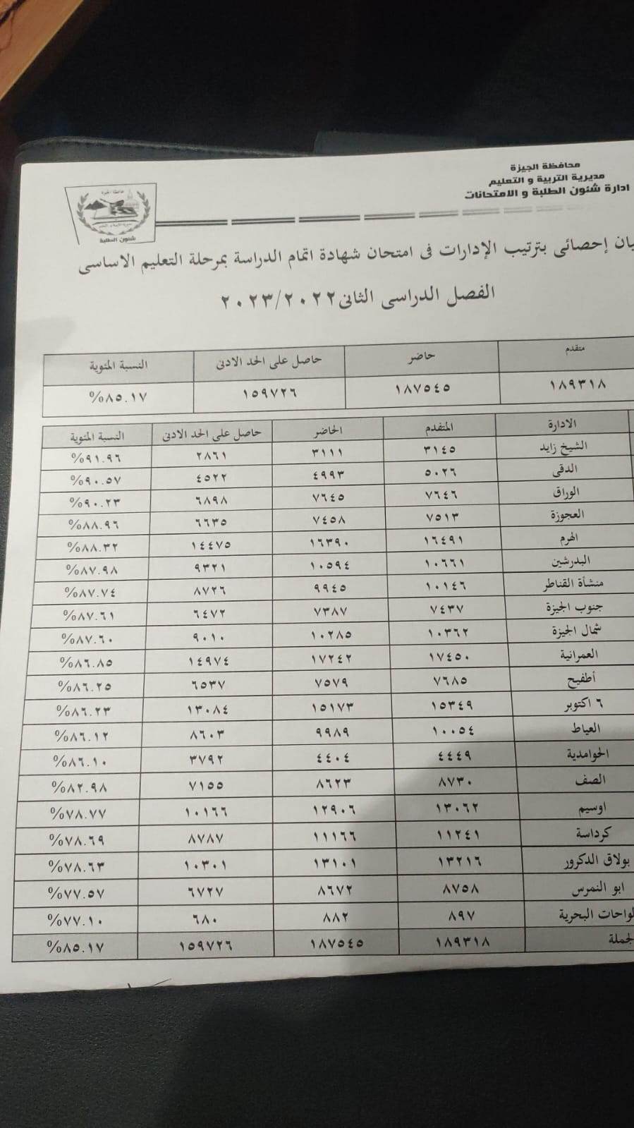نتيجة الشهادة الإعدادية بالجيزة،اعتمد اللواء أحمد راشد محافظ الجيزة نتيجة شهادة إتمام الدراسة بمرحلة التعليم الأساسي (الشهادة الإعدادية) للعام الدراسى ٢٠٢2 / ٢٠٢3 (الدور الأول) وذلك بحضور أشرف سلومة مدير مديرية التربية والتعليم بالجيزة.