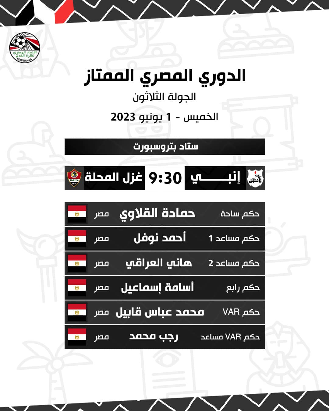 الدوري المصري، أعلنت لجنة الحكام الرئيسية باتحاد الكرة، طاقم حكام مباراتي حرس الحدود أمام أسوان، ومباراة إنبي أمام غزل المحلة المقرر إقامتهما مساء اليوم الخميس ضمن مواجهات الجولة 30 من الدوري المصري الممتاز على النحو التالي: