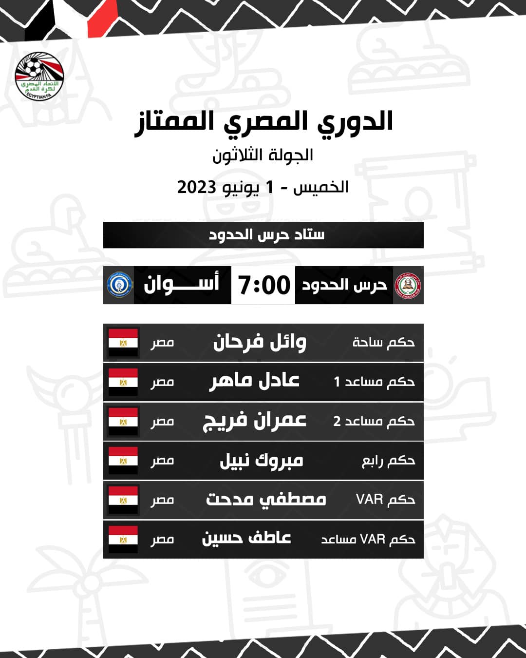 فيما أعلنت لجنة الحكام الرئيسية باتحاد الكرة، طاقم حكام مباراتي حرس الحدود أمام أسوان، المقرر إقامتها مساء اليوم الخميس ضمن مواجهات الجولة 30 من الدوري المصري الممتاز على النحو التالي: