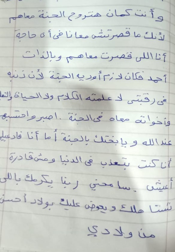 وكتبت الأم، "أنا يا محمد وديت (أرسلت) ولادك للجنة، أنت كمان هتروح (تذهب) معاهم الجنة، علشان (لأنك) ماقصرتش معانا في حاجة، أنا اللي قصرت معاهم وخصوصًا أحمد، فكان لازم أوديه الجنة، لأن ذنبه في رقبتي، لا علّمته الكلام ولا التعليم، وإخواته معاه في الجنة، اصبر واحتسبهم عند الله، ويا بختك بالجنة، أما أنا فادعيلي علشان كنت بتعذب في الدنيا ومش قادرة أعيش، سامحني ربنا يكرمك باللي تستاهلك ويعوض عليك بولاد أحسن".
