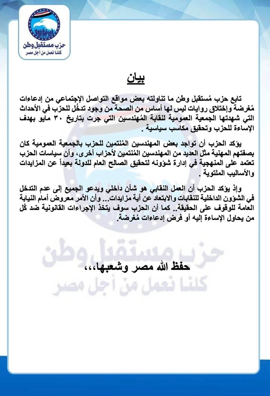 تابع حزب مستقبل وطن ما تناولته بعض مواقع التواصل الاجتماعي من ادعاءات مغرضة واختلاق روايات قال إنها ليس لها أساس من الصحة من وجود تدخل للحزب في الأحداث التي شهدتها الجمعية العمومية لنقابة المهندسين التي جرت بتاريخ ۳۰ مايو بهدف الإساءة للحزب وتحقيق مكاسب سياسية.